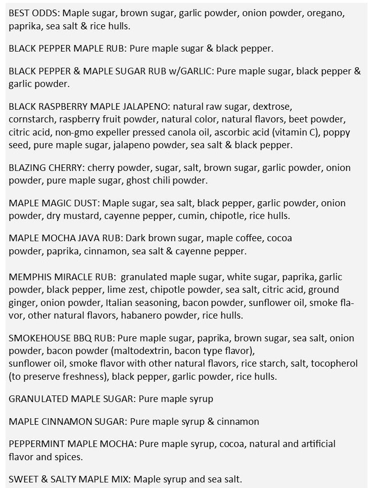 NEW ~ 3 pack of Maple Rubs. Great on meat, as a seasoning in sauces, top your vegetables. Or try our sweet toppings on toast, oatmeal, ice cream or popcorn.